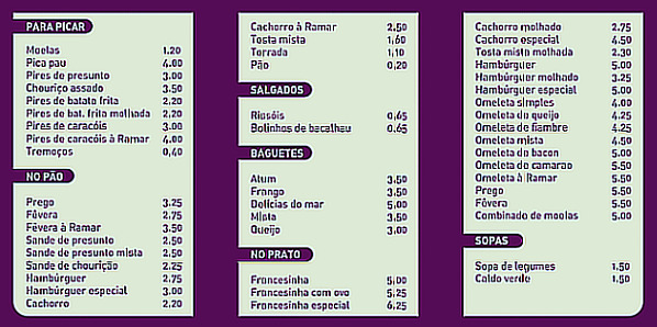 Let's take the following menu from the "Ramar Cafe" as an example, and let's start ordering some food in Portuguese: (If you cannot read, you can press the "Ctrl" key plus "+" to increase the size of the picture).